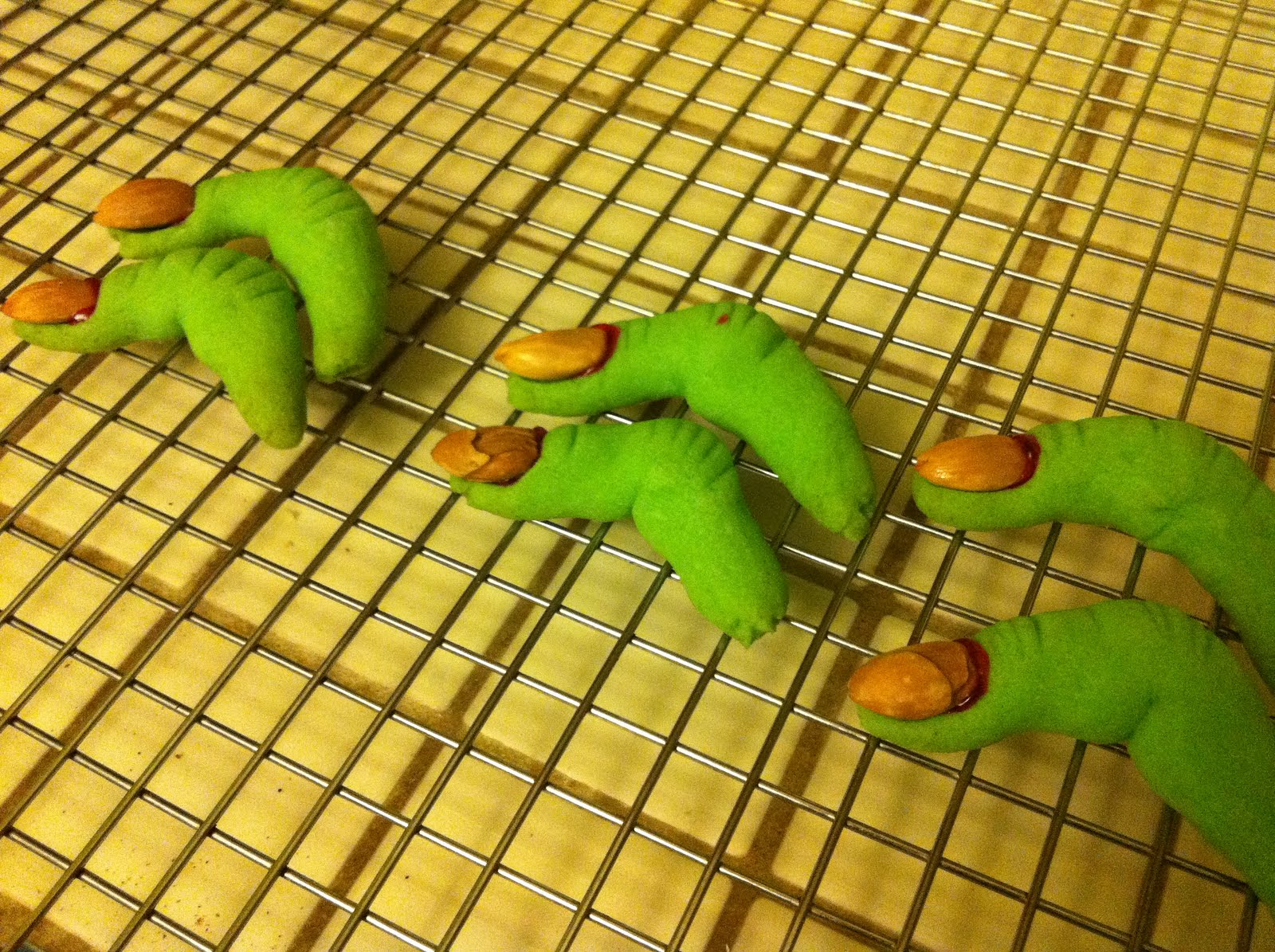 Roll a small ball (heaping teaspoon) into a snake about three inches long and no more than half-inch in diameter. Bend to oblique angle as shown, pushing dough a little toward bend, so the knuckle is slightly fatter. Press almond into one end for fingernail, then use paring knife to slash wrinkles at the knuckles.