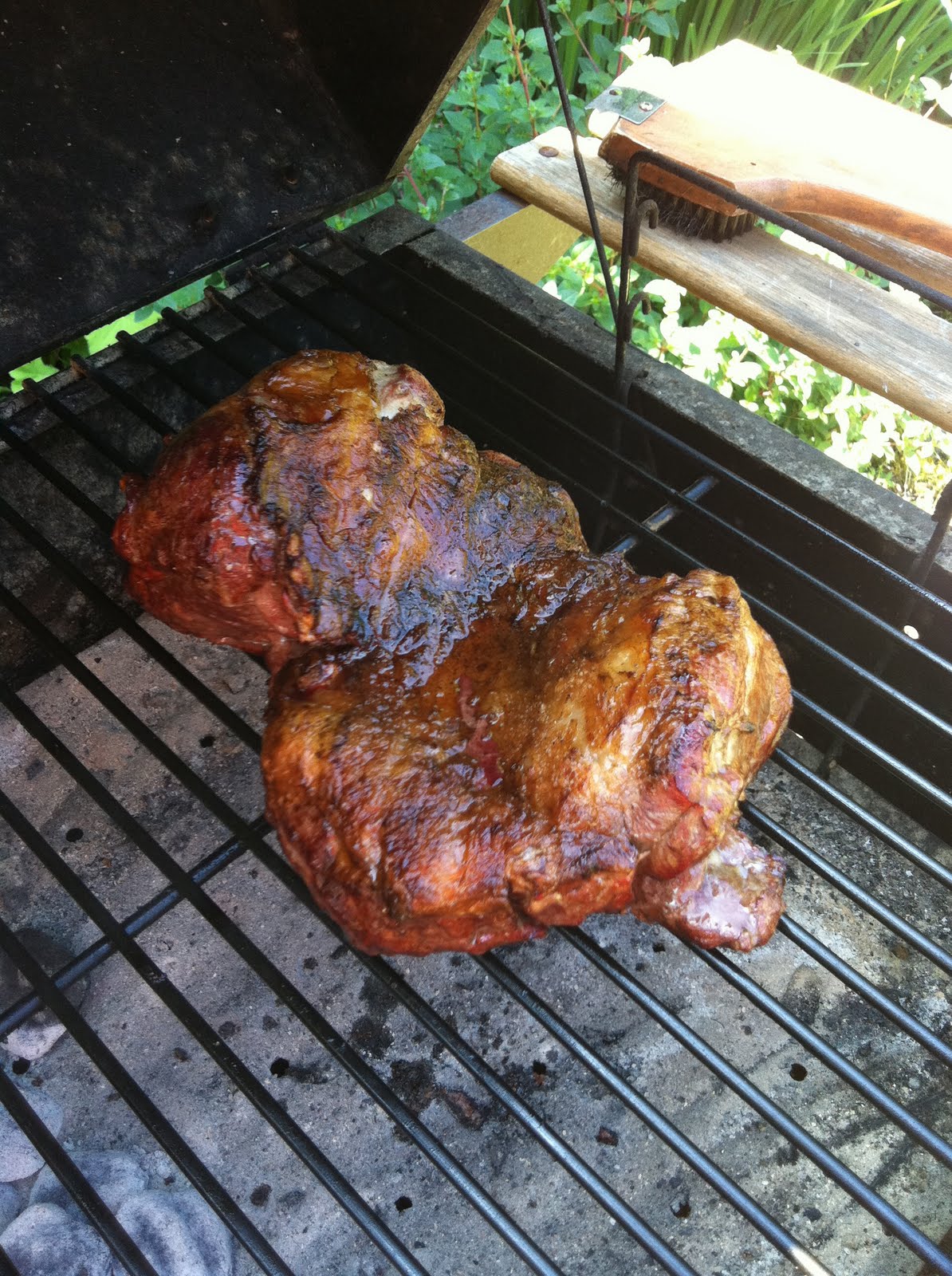 The meat, just after moving to the cool side of the grill. I browned it well, then moved it over and closed the lid for a couple of hours, until the temp on the grill started dipping. Then I moved it to a foil-covered roasting pan and finished it in the oven at 300 for a couple more hours.
